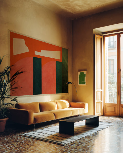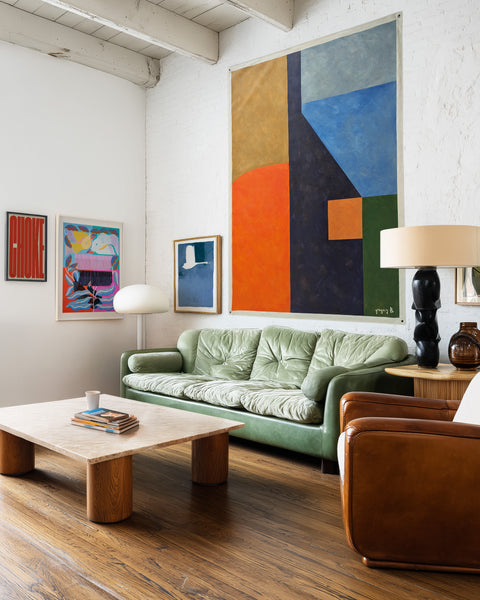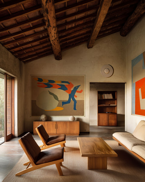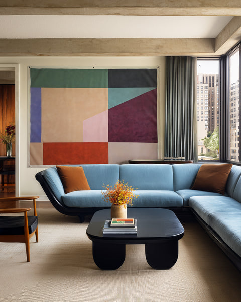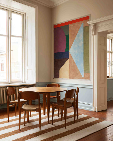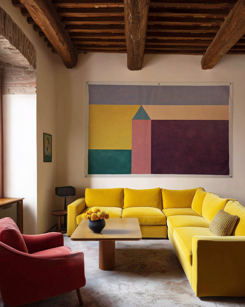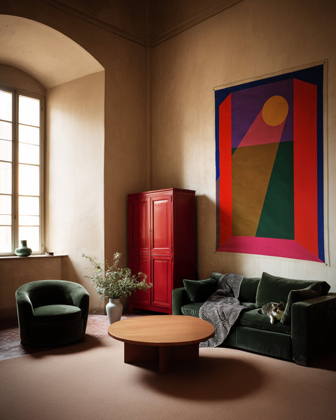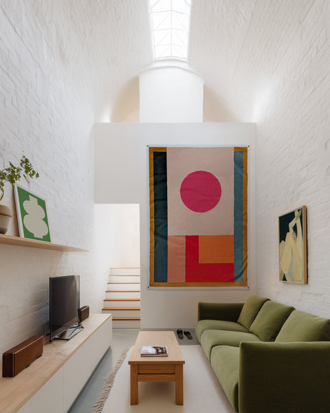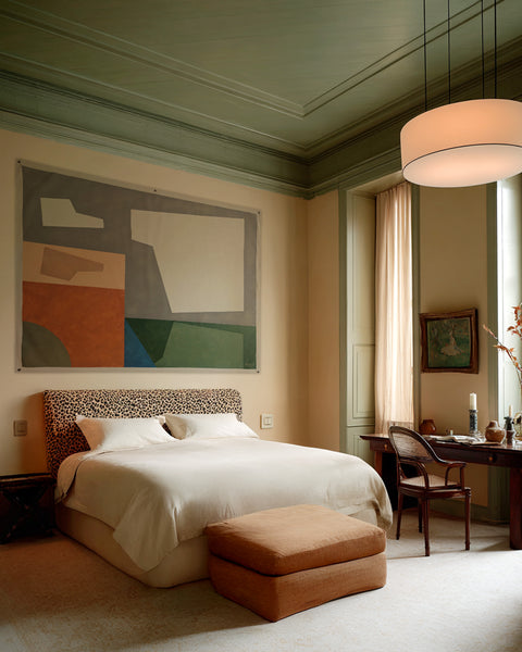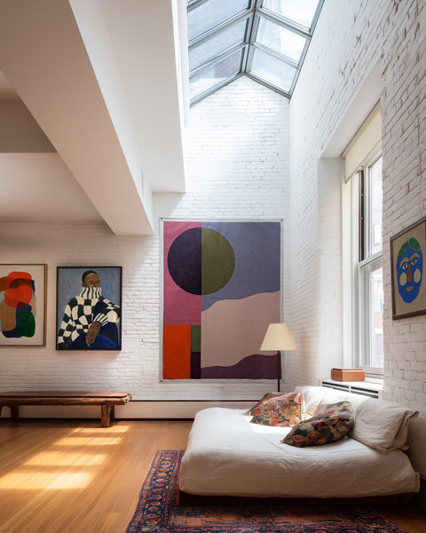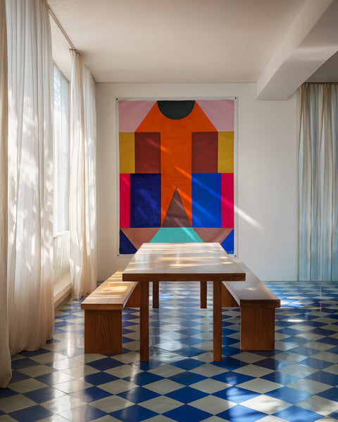 Painting directly onto raw unstretched canvas, I create vibrant tapestry-like pieces.